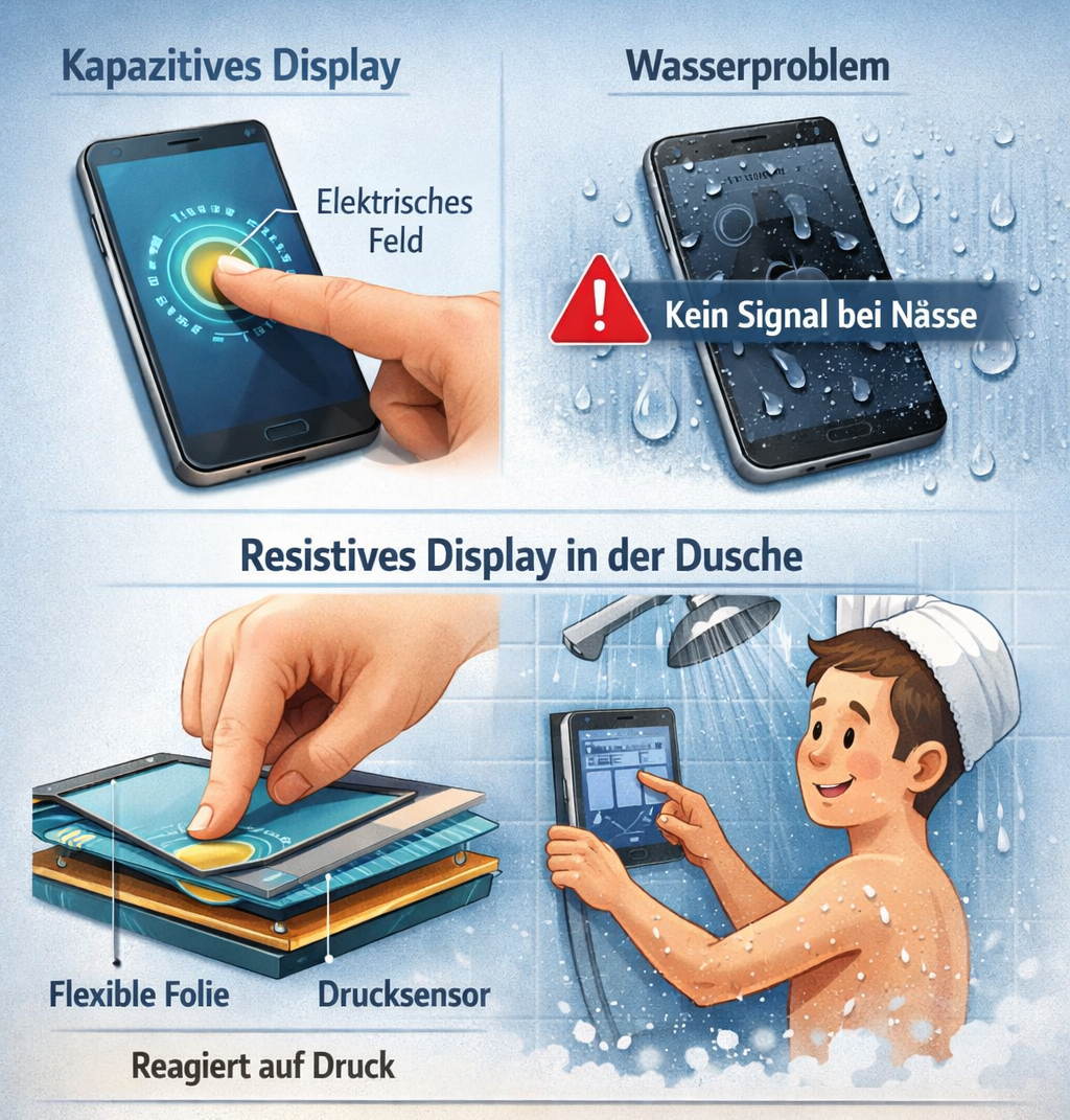 Moderne Displays erfassen Berührungen über ein kapazitives Touchsystem. Dabei wird auf der Displayoberfläche ein elektrisches Feld erzeugt, das sich bei Kontakt mit einem leitfähigen Objekt, wie einem Finger, verändert. Auch Wasser kann dieses Feld beeinflussen, wodurch die Berührungserkennung unter feuchten Bedingungen eingeschränkt ist.